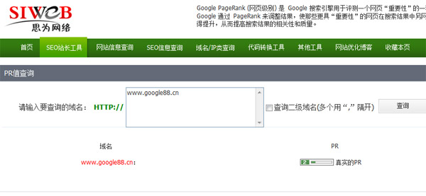 通過SEO工具查詢PR值:http://www.sw996.com/tool/pr/pr.php 查詢網(wǎng)站www.google88.cn 網(wǎng)站PR值已經(jīng)更新為2,更新時間:2010-9-24,以下是查詢圖:
