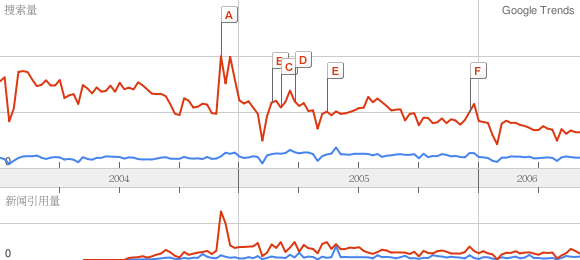 3、標(biāo)注,百度指數(shù)不提供標(biāo)注,就是說(shuō)只能看到變動(dòng)的趨勢(shì),卻無(wú)法知道為什么會(huì)引起這樣的線圖變化,google就提供標(biāo)注,例如在圖片上看到,在峰值的位置,有A、B、C、D、E這樣的標(biāo)注,在旁邊,就有當(dāng)時(shí)的新聞,這點(diǎn)是google trends最好的地方,一個(gè)關(guān)鍵字在如此大量的搜索基數(shù)面前還會(huì)有如此大幅度的變化,肯定是某些原因引起的,可能是負(fù)面新聞,可能是明星,可能是增加了廣告投入,在google中不但能體現(xiàn),還可以知道事情的發(fā)生,對(duì)于媒體人士來(lái)說(shuō)非常有用,可以隨時(shí)回顧當(dāng)時(shí)的事情。