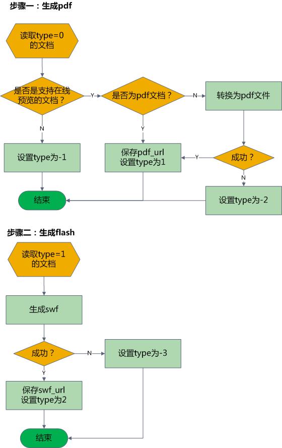 下圖是文檔轉(zhuǎn)化到swf的一個流程,其中type是文檔的一個狀態(tài)標(biāo)識(0表示未處理過的文檔,1表示已生成pdf,2表示已生成flash,-1表示不受支持的文檔格式,-2表示轉(zhuǎn)化為pdf失敗,-3表示轉(zhuǎn)化為flash失敗)