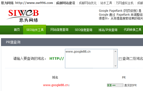 2011年1月Google對衡量全球網(wǎng)站權(quán)威性的重要指標(biāo)PR值(PageRank),進行了小規(guī)模的更新。在此次更新中,思為網(wǎng)絡(luò):成都網(wǎng)站建設(shè)網(wǎng)站(http://www.google88.cn/)的PR值被再次上調(diào)到3 ;另一網(wǎng)站: http://www.sw996.com PR值是5 沒有進行更新