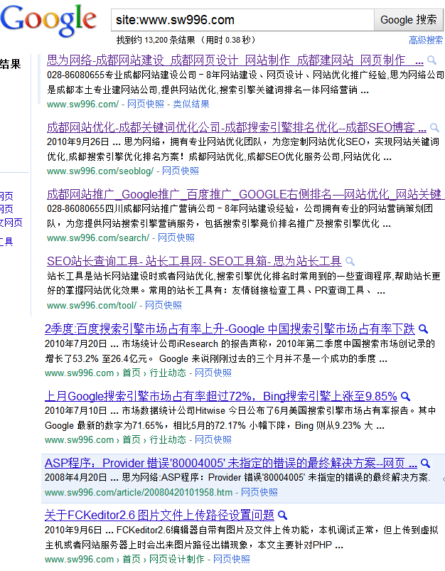最近查詢成都思為網(wǎng)絡(luò)公司網(wǎng)站:http://www.sw996.com 在谷歌中收錄大量提升,2011.2.22日查詢?nèi)缦聢D,收錄數(shù)量達(dá)到(13,200條)